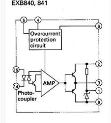 EXB841 features: (1)Various series; (2)Standard series: For up to 10 kHz operation; (3)High-speed series: For up to 40 kHz operation; (4)These series cover the full range of IGBT products; (5)Built-in photocoupler for high isolation voltage: 2500V AC for one minute; (6)Single supply operation; (7)Built-in overcurrent protection circuit; (8)Overcurrent detection outpur; (9)SIL package for high-density mounting.